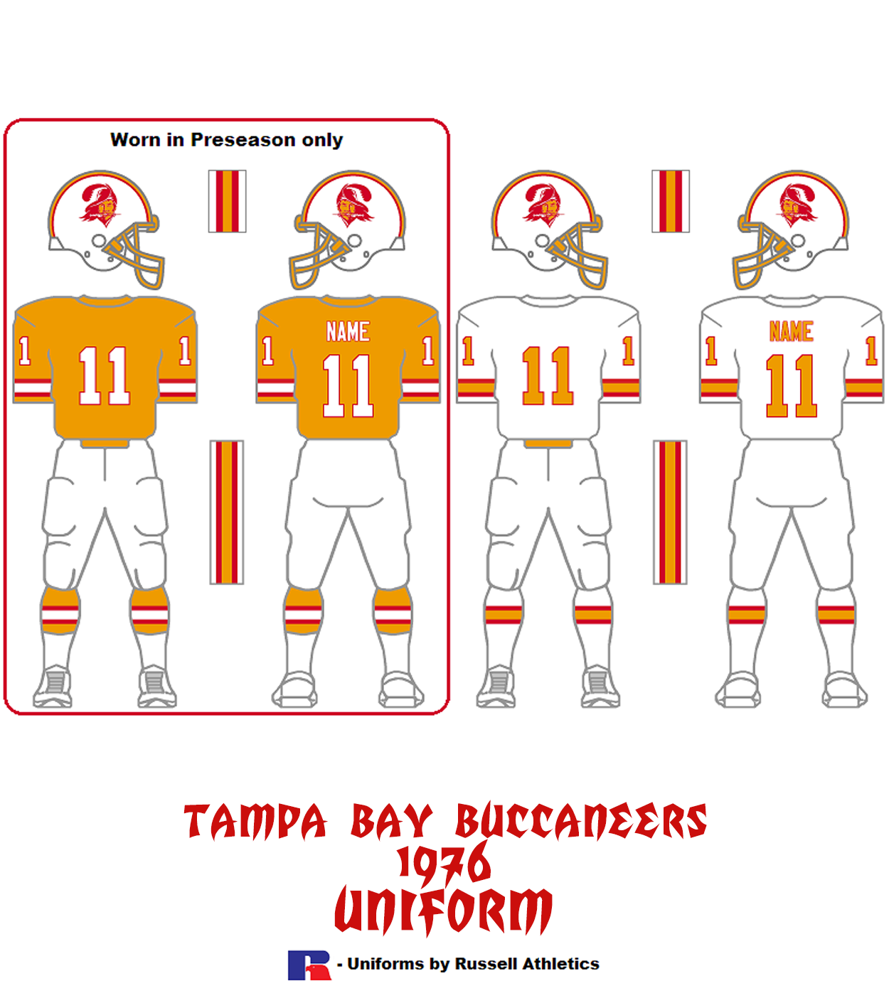 The franchise’s first season was in 1976, The 1976 road uniform, worn by the likes of QB Steve Spurrier, running back Ed Williams, and tight end Bob Moore, is quite unique! This was the only year in the franchise’s history where the team had orange jersey numbers with red trim.
