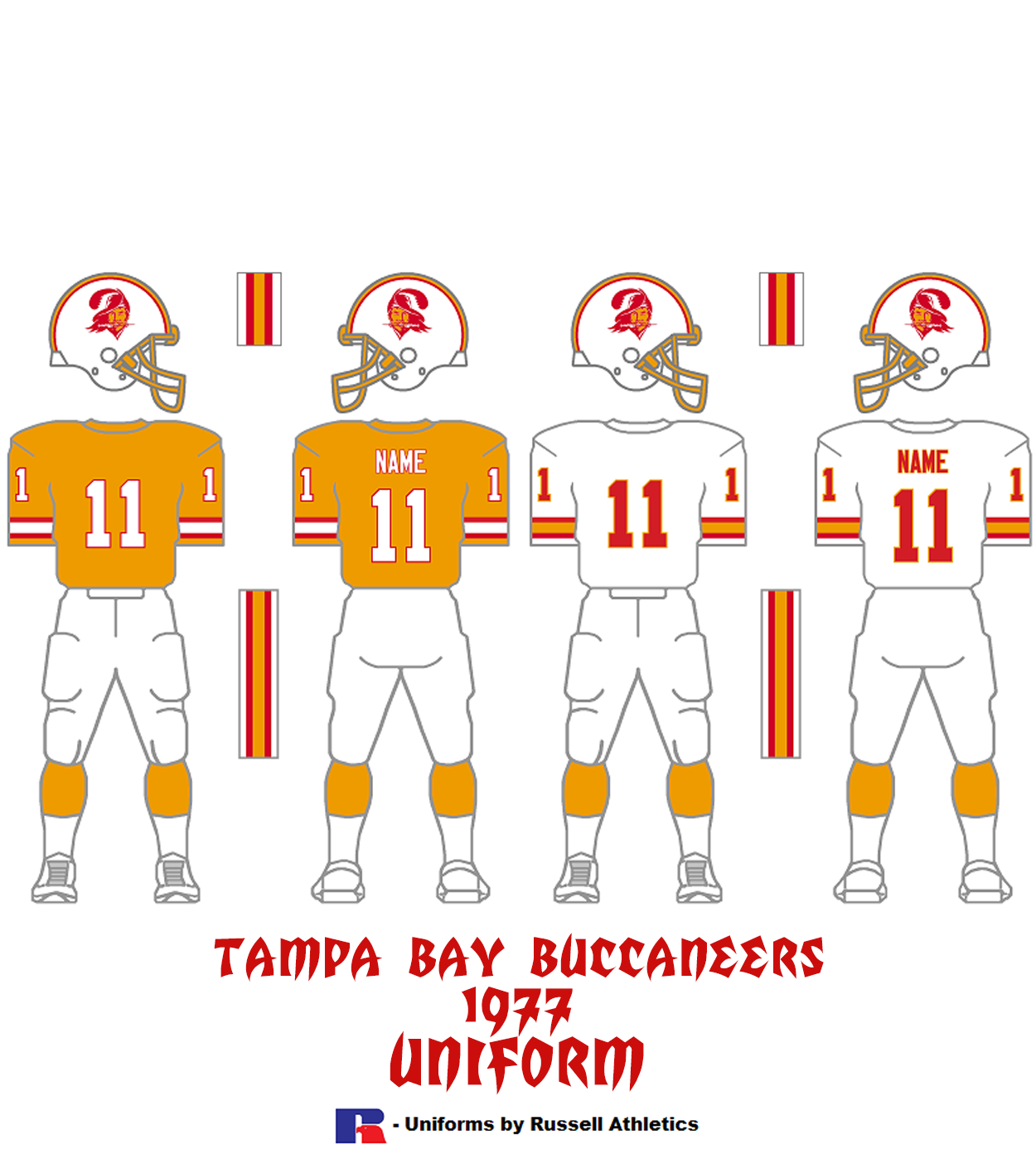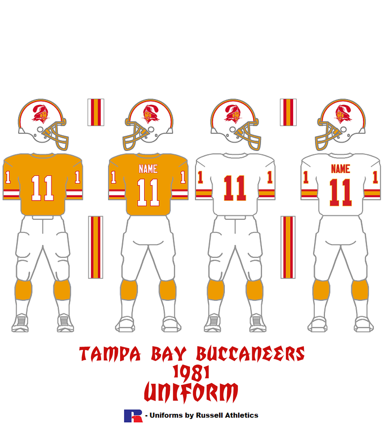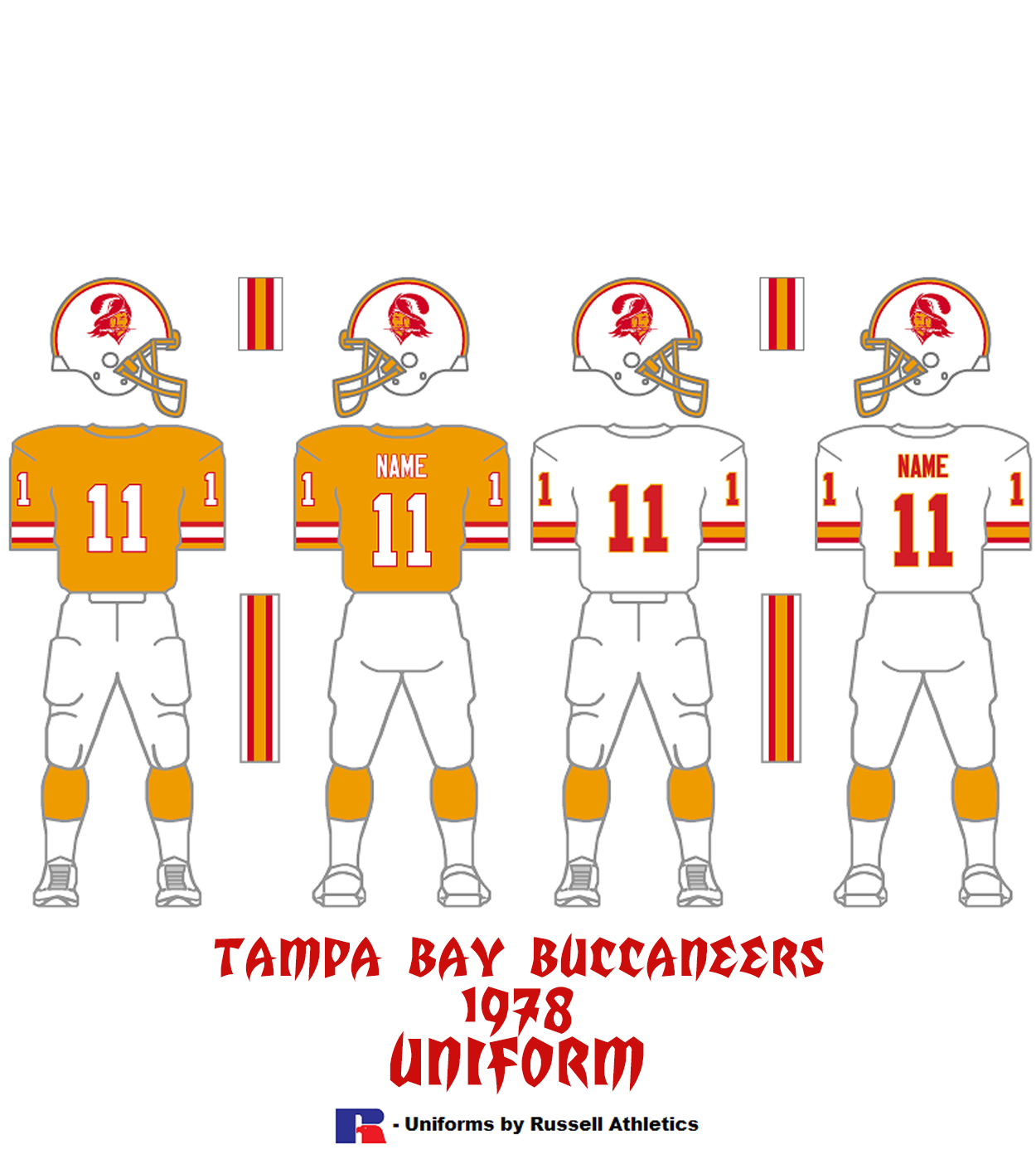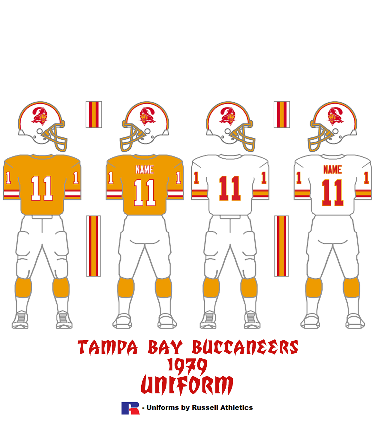 The 1979 home orange uniform, worn by the likes of QB Doug Williams, and young, talented running back Ricky Bell, showcases a rich, orange jersey – complete with white numbers and a white pant / belt ensemble.
