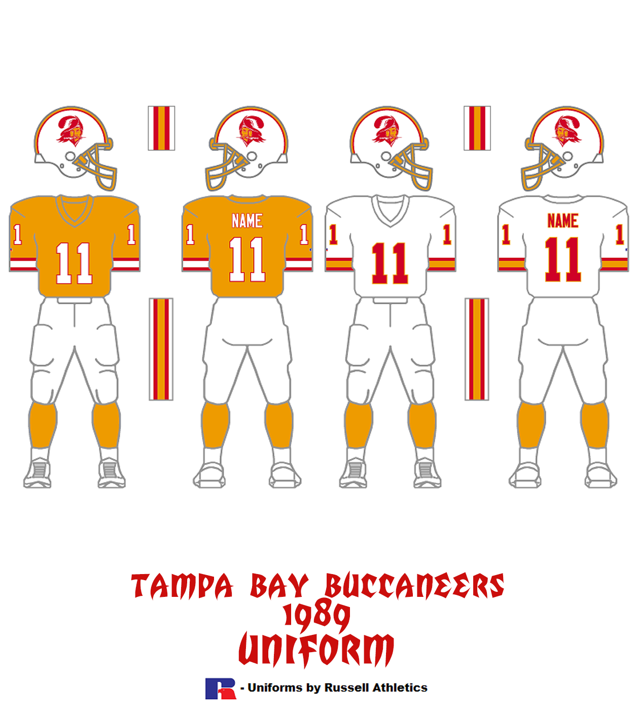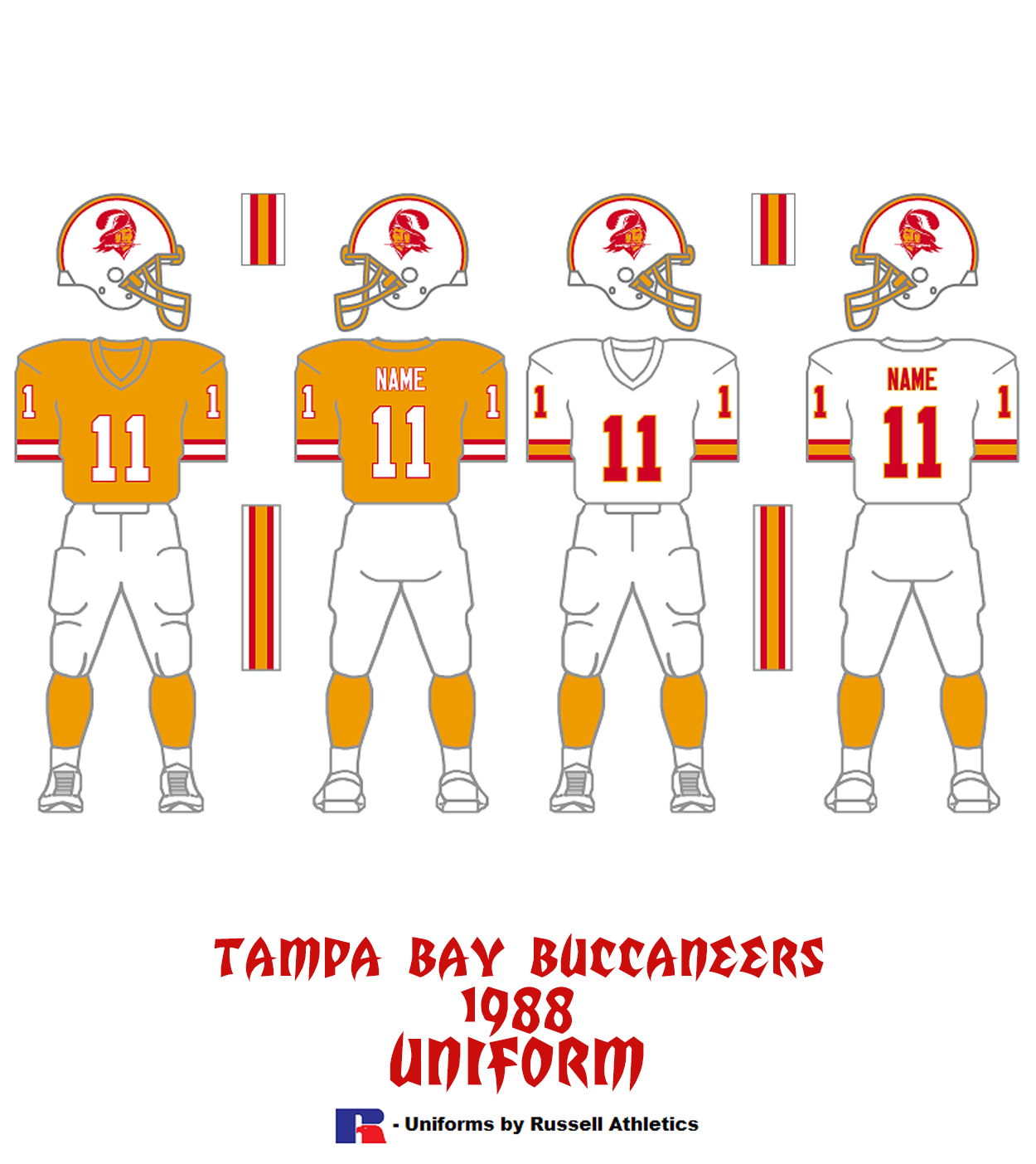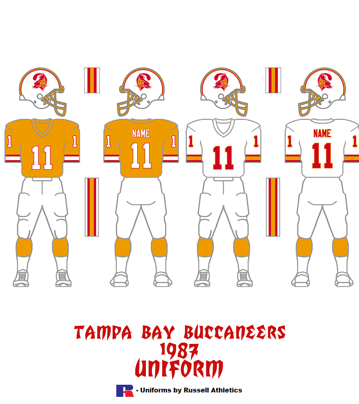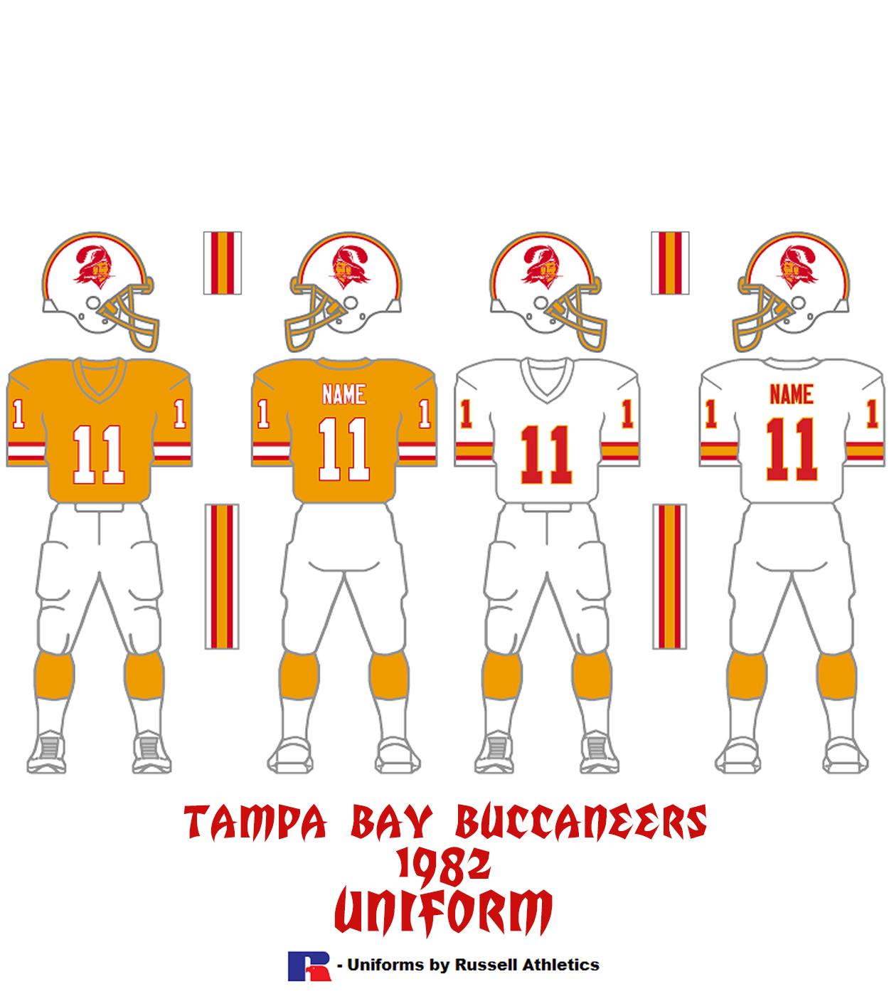 The 1979 home orange uniform, worn by the likes of QB Doug Williams, and young, talented running back Ricky Bell, showcases a rich, orange jersey – complete with white numbers and a white pant / belt ensemble.