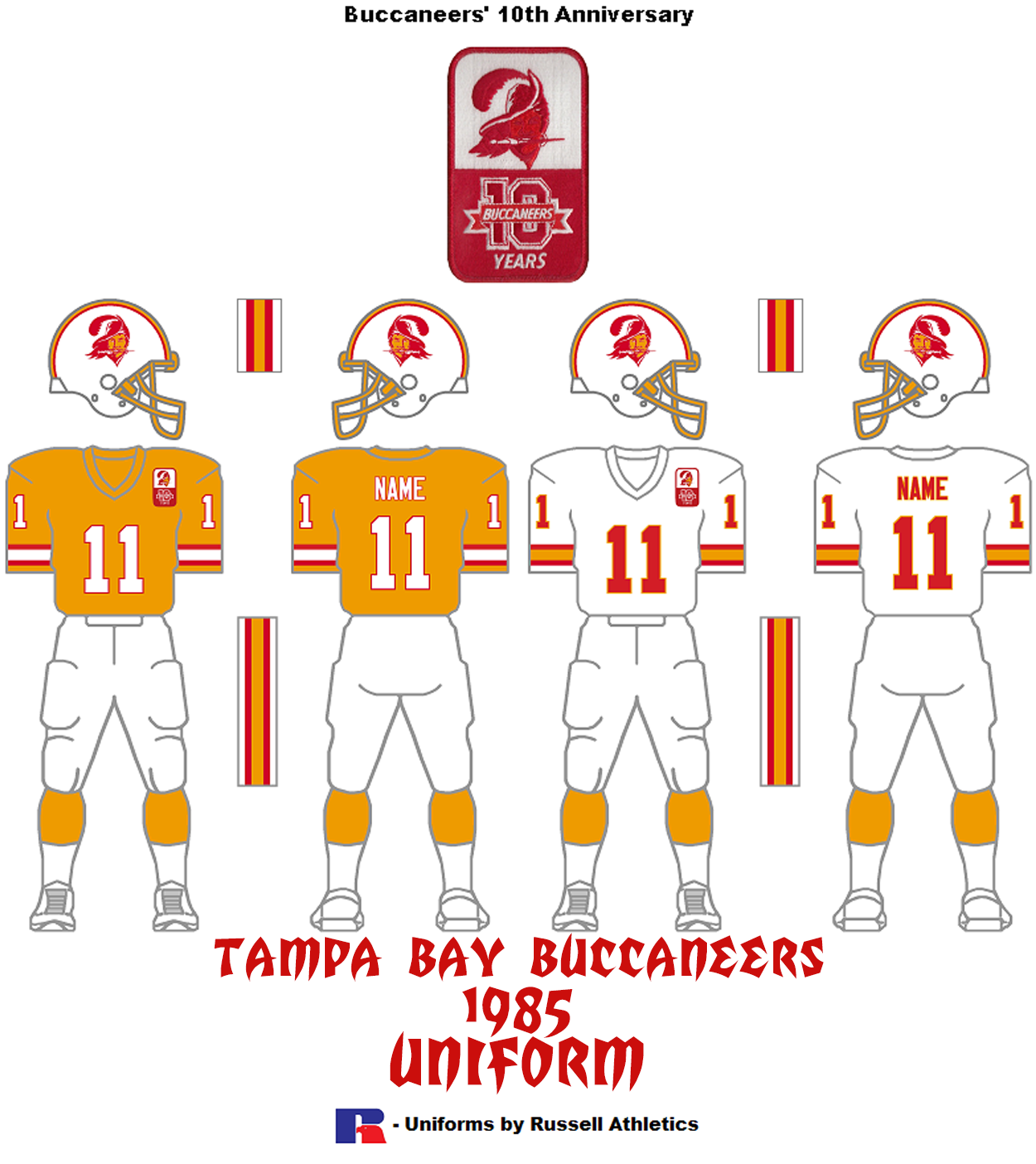 The 1985 uniform, as worn by James Wilder, QB Steve DeBerg and kicker Donald Igwebuike, has some distinct, interesting features to it.