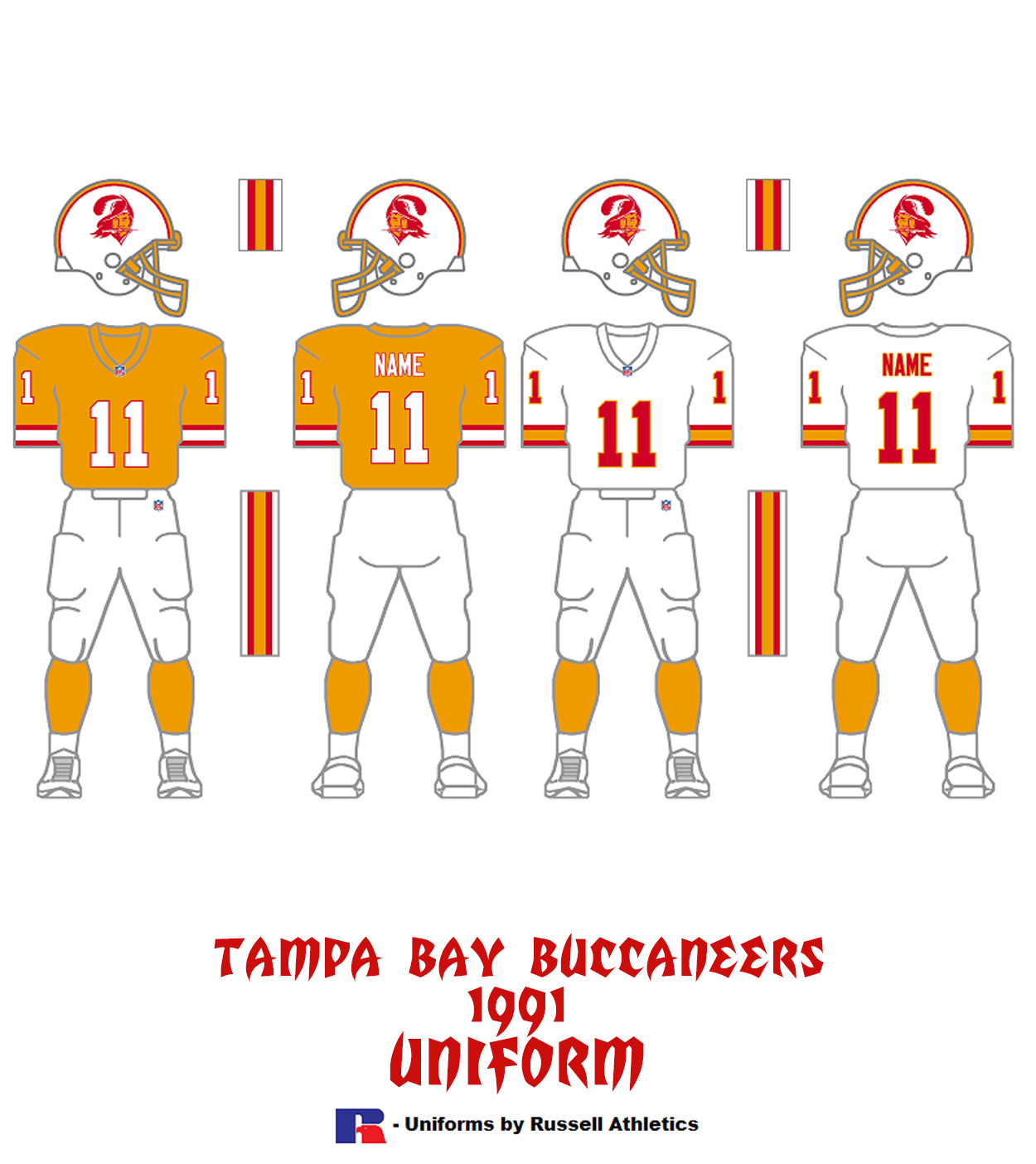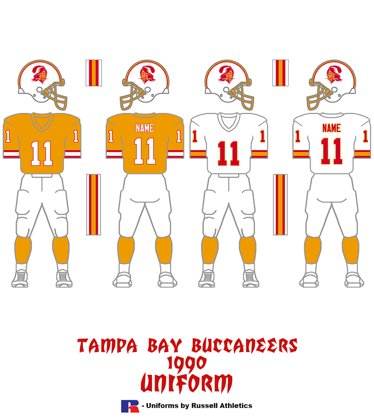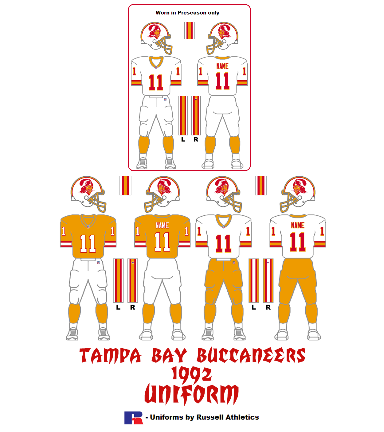 The 1992 uniform shown here showcases several new features – both the shirt collar and pants have been converted from white to orange. Also, the size of the mesh holes, so large in the early 80’s, have been decreased so as not to be quite so noticeable as to make the jersey almost transparent. And if you look very closely at the helmet, you might notice that the logo has been altered slightly right below the Buccaneer’s chin, the neckline or shirt collar is no longer white, it has become orange. A small change yes, but a change nonetheless that someone took pains to implement.