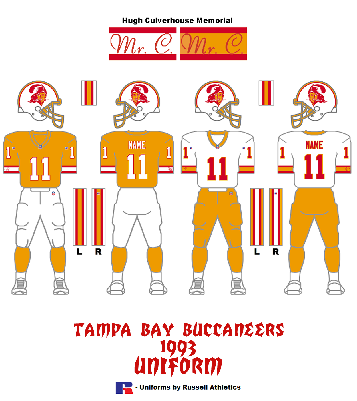 If you look very carefully at the 1993 road white uniform, you might just see it. There, just on top of the orange & red stripe pattern on the right sleeve is some writing. If you saw a profile of the right arm, you’d be able to read the tribute paid by the Buccaneers to the only owner the team had known - long-time owner Hugh Culverhouse – who passed away prior to the 1993 season. It simply reads: ‘Mr. C’.