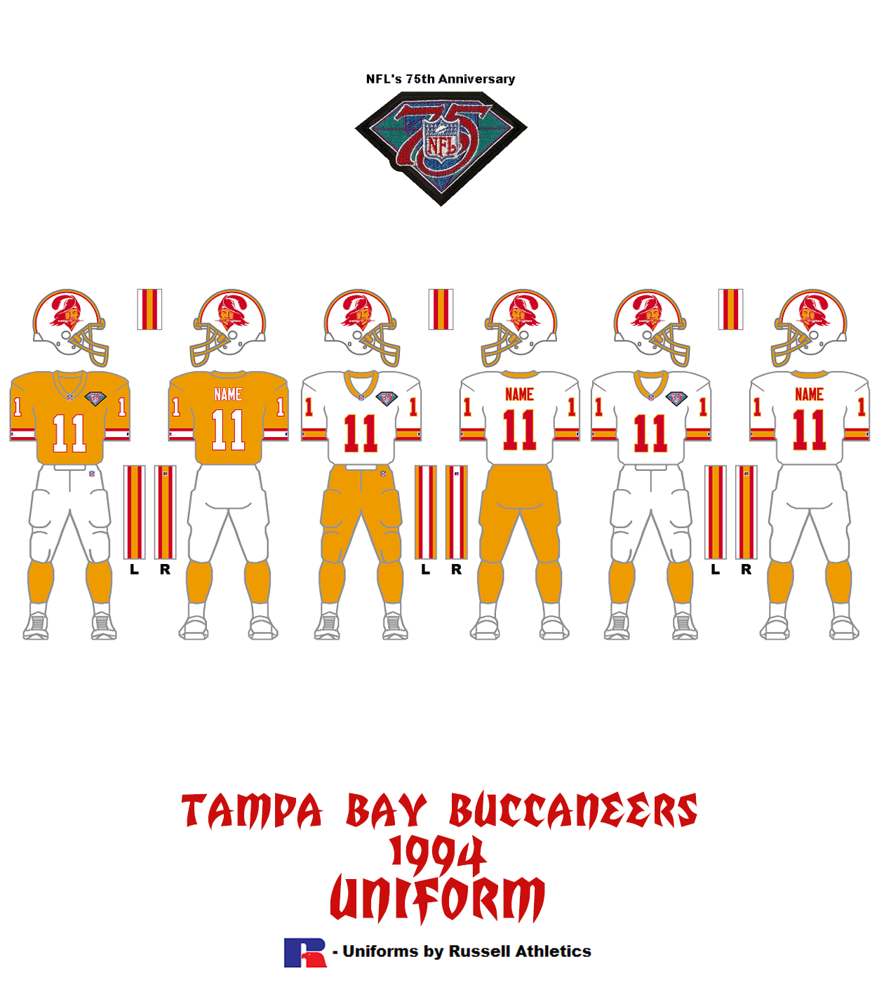 The Bucs’ 1994 orange throwback home jersey, as worn by QB Trent Dilfer and linebacker Hardy Nickerson, was a tribute to the 1977 home uniform worn by Tampa Bay’s first generation of stars such as Lee Roy Selmon, running back Ricky Bell, QB Gary Huff and wide receiver Morris Owens. If you look closely, you’ll see the diamond-shaped NFL patch commemorating the 75th anniversary on the upper left chest.