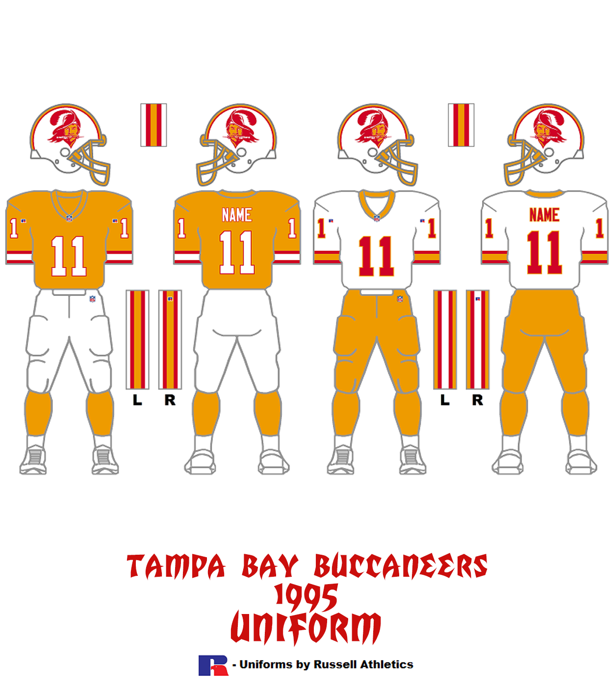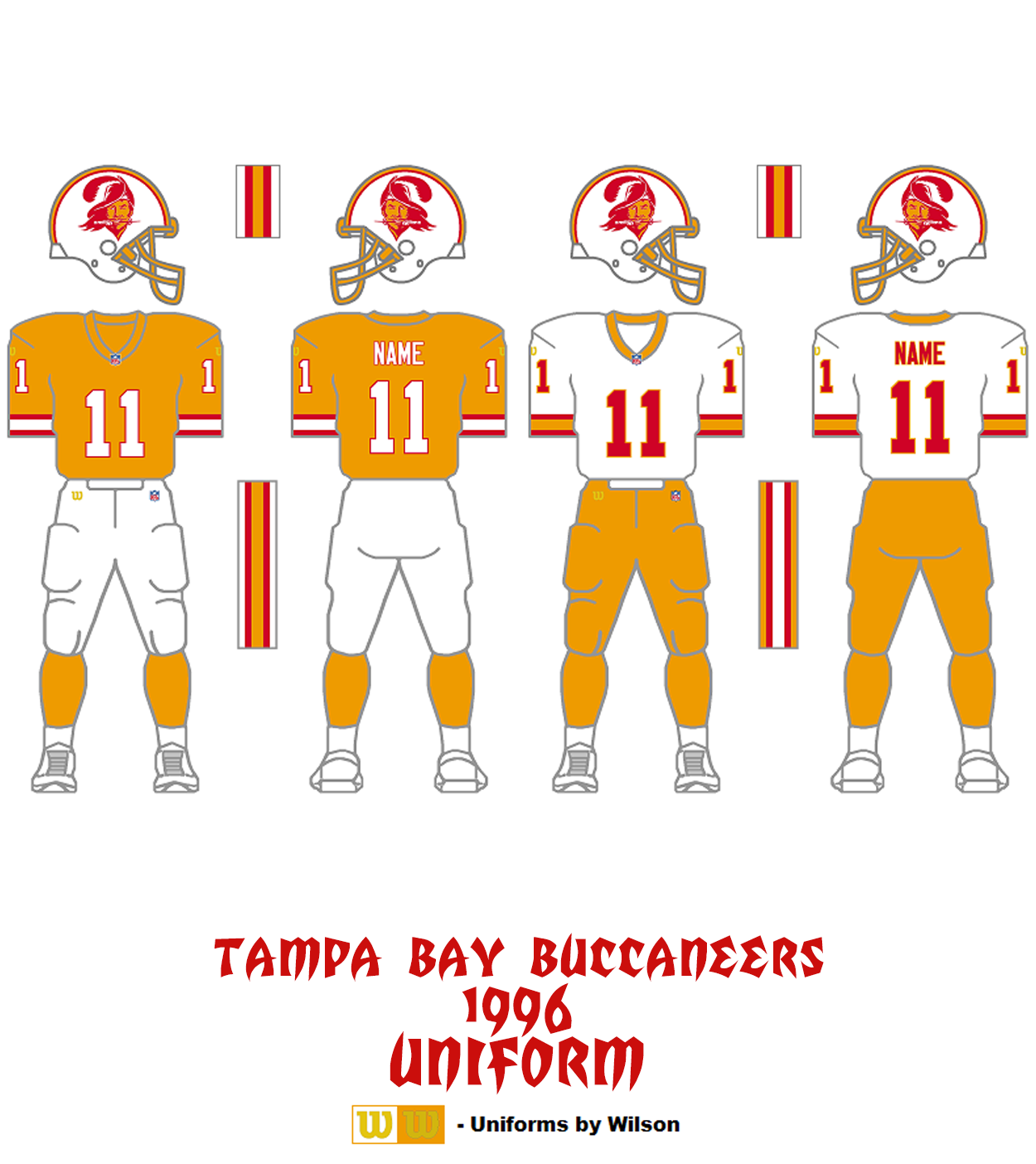 The Buccaneers changed uniforms just prior to the 1997 season, switching from the creamsicle orange color scheme with the winking Bucco Bruce on a white helmet, to the very popular pewter and red combination that sported a menacing pirate and flag on a pewter-based helmet.