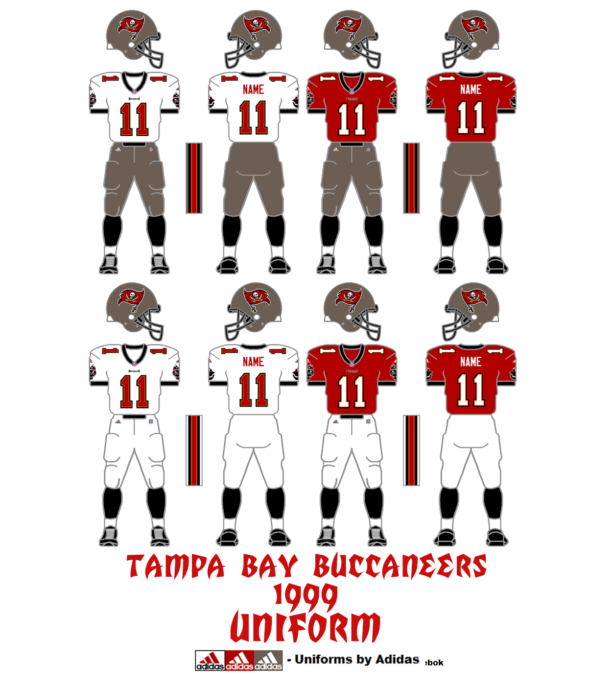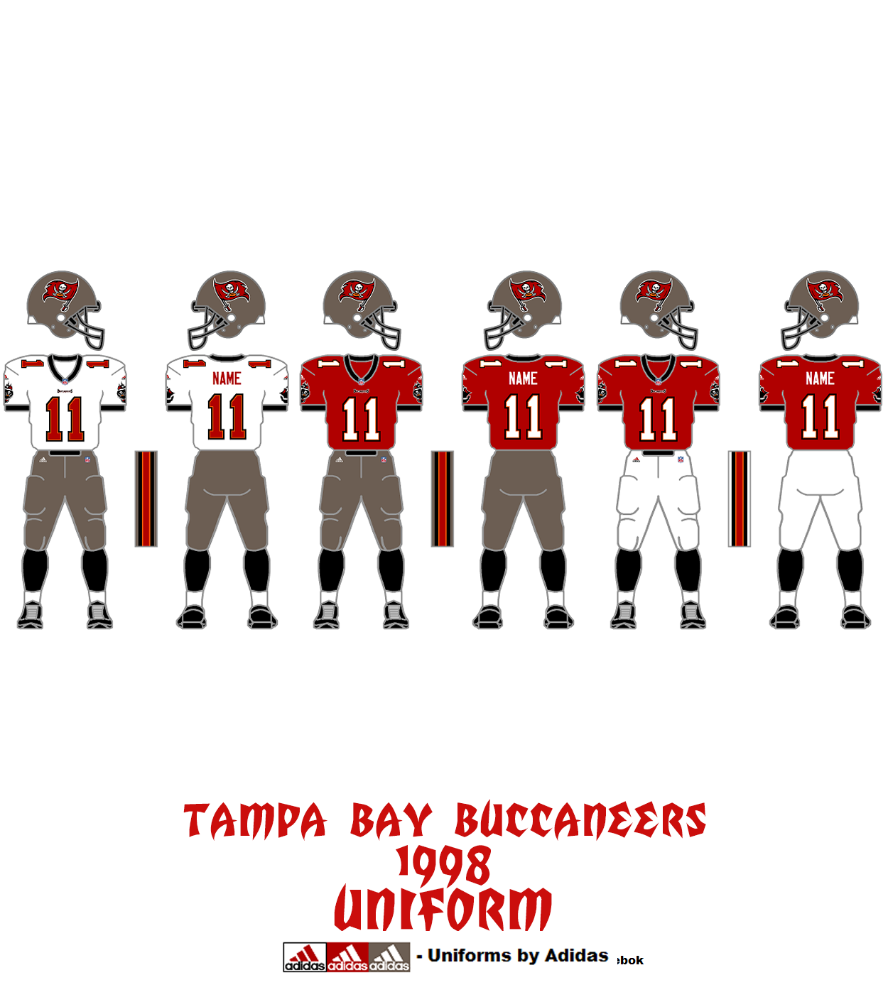 The 1998 home red uniform, as worn by the lethal backfield combination of Mike Alstott & Warrick Dunn, showcases virtually all of the new elements explained earlier in the 1997 road white uniform.