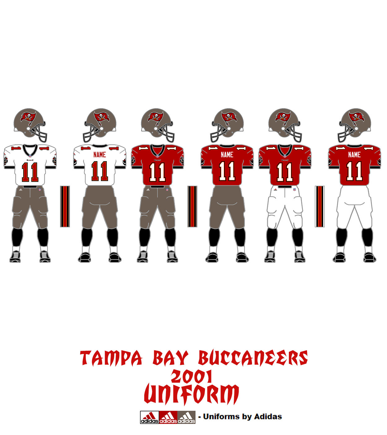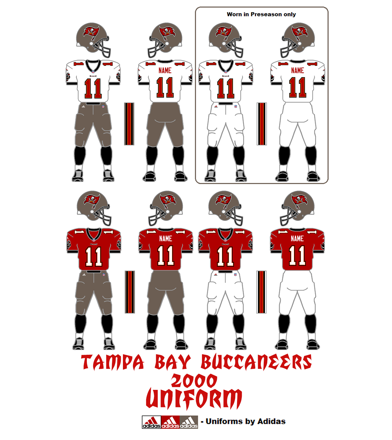 This 2000 road uniform, as worn by newcomer Keyshawn Johnson, defensive tackle Warren Sapp and safety John Lynch, is very similar to the 1997 design.