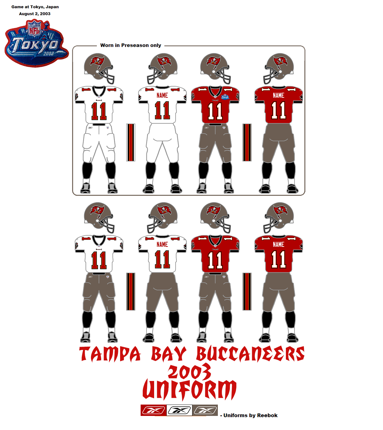 In 2003, the Buccaneers introduced a practice jersey that featured orange piping. In 2004, a pewter practice jersey was used, with numerals in the Totally Gothic font.