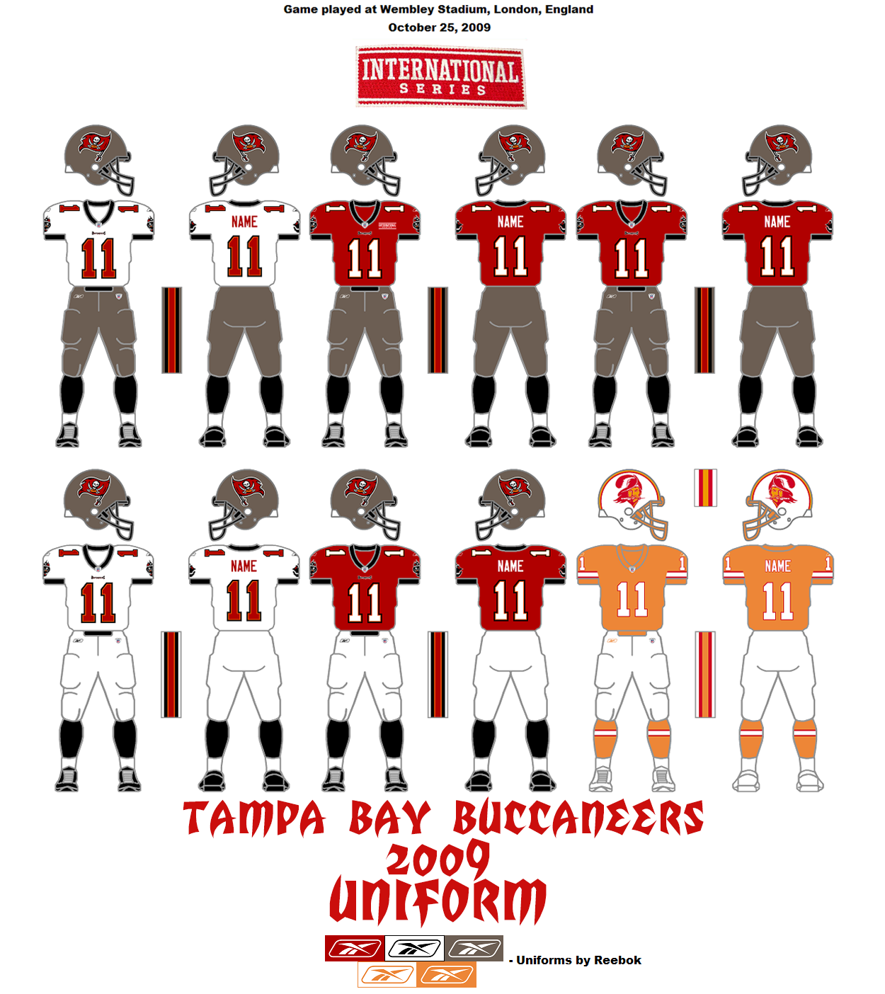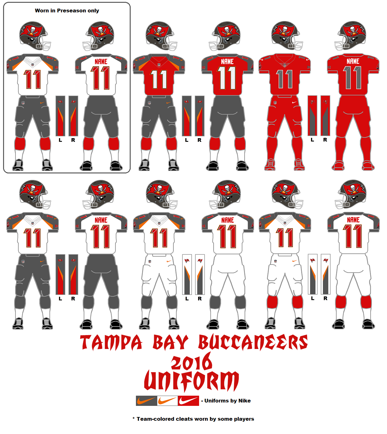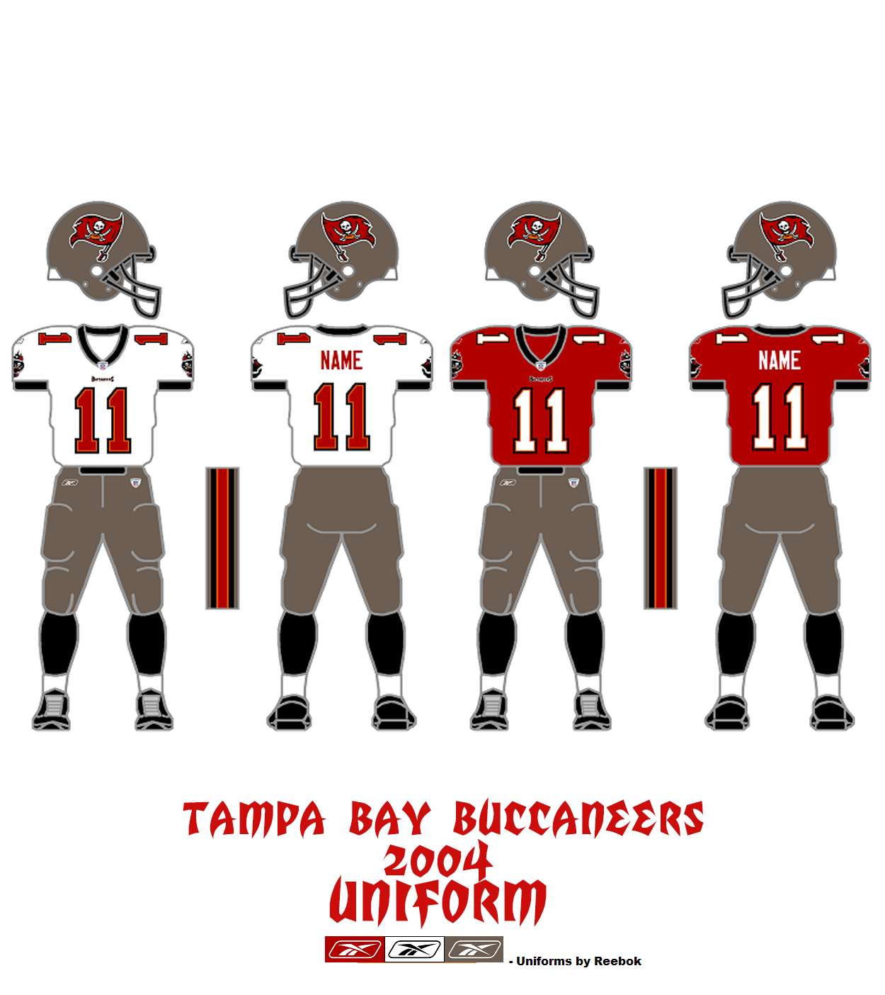 The base uniform color has been energized with richer pewter, juxtaposed with a brighter, more vibrant shade of "Buccaneer Red". In homage to the Buccaneers' early uniforms, the look also features "Bay Orange" as a new primary trim color and accent on both the jersey and the pants. Tampa Bay also becomes the first NFL franchise to incorporate a revolutionary reflective chrome border around the numbers on the front, back and shoulders. The chrome border incorporates a technologically advanced reflective coating that adds a new dimension, increased readability and a unique glow to the numbers.