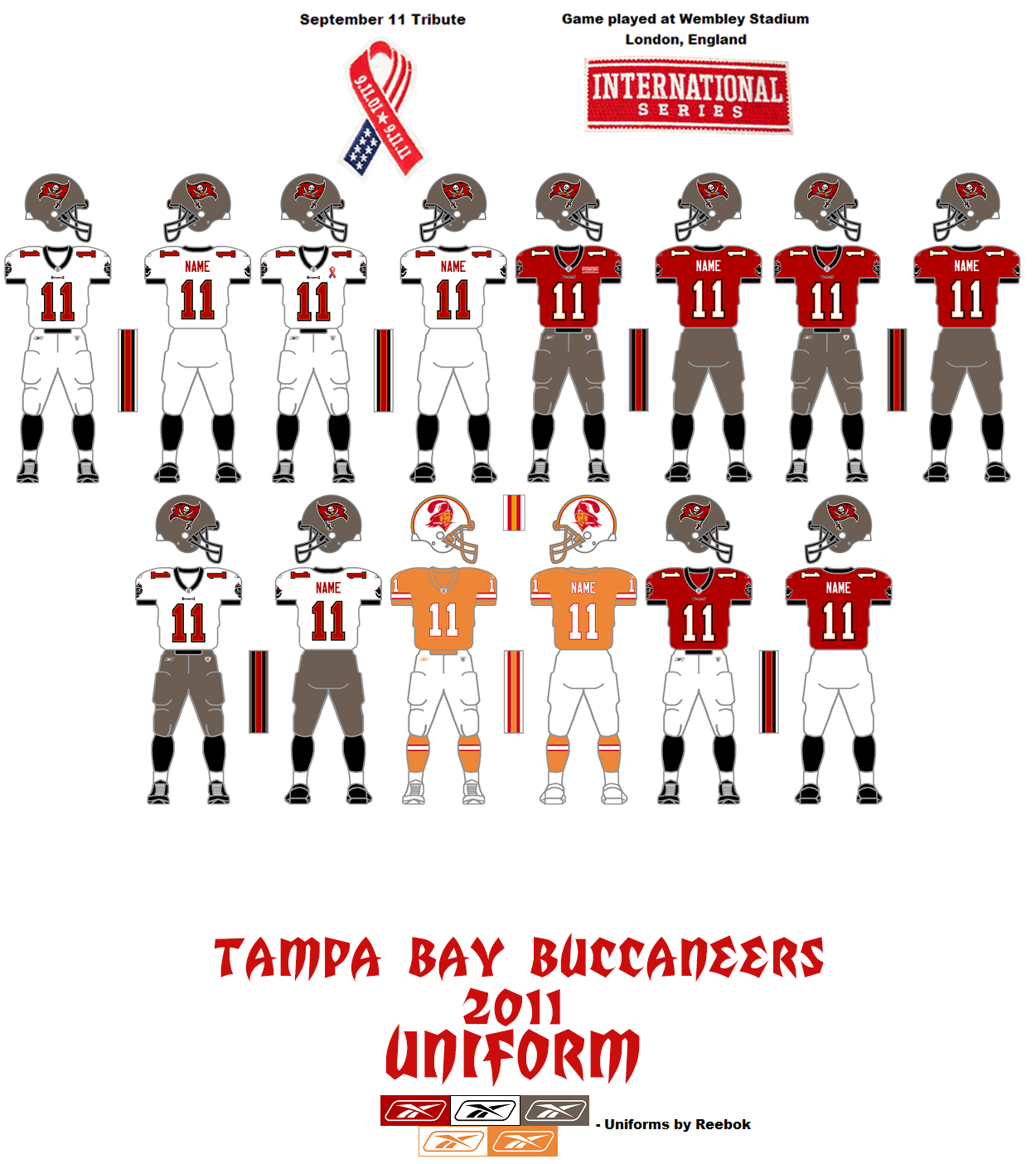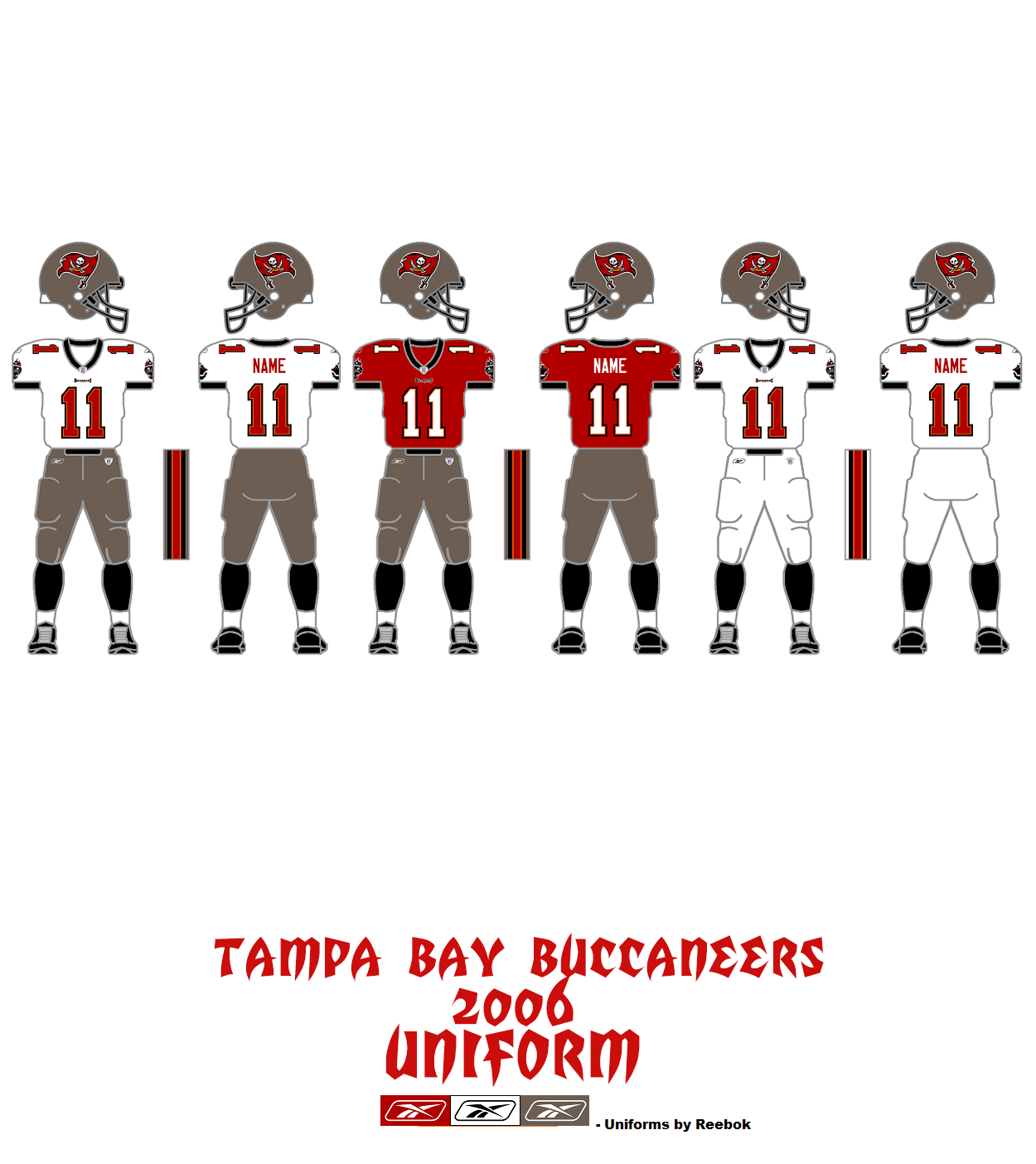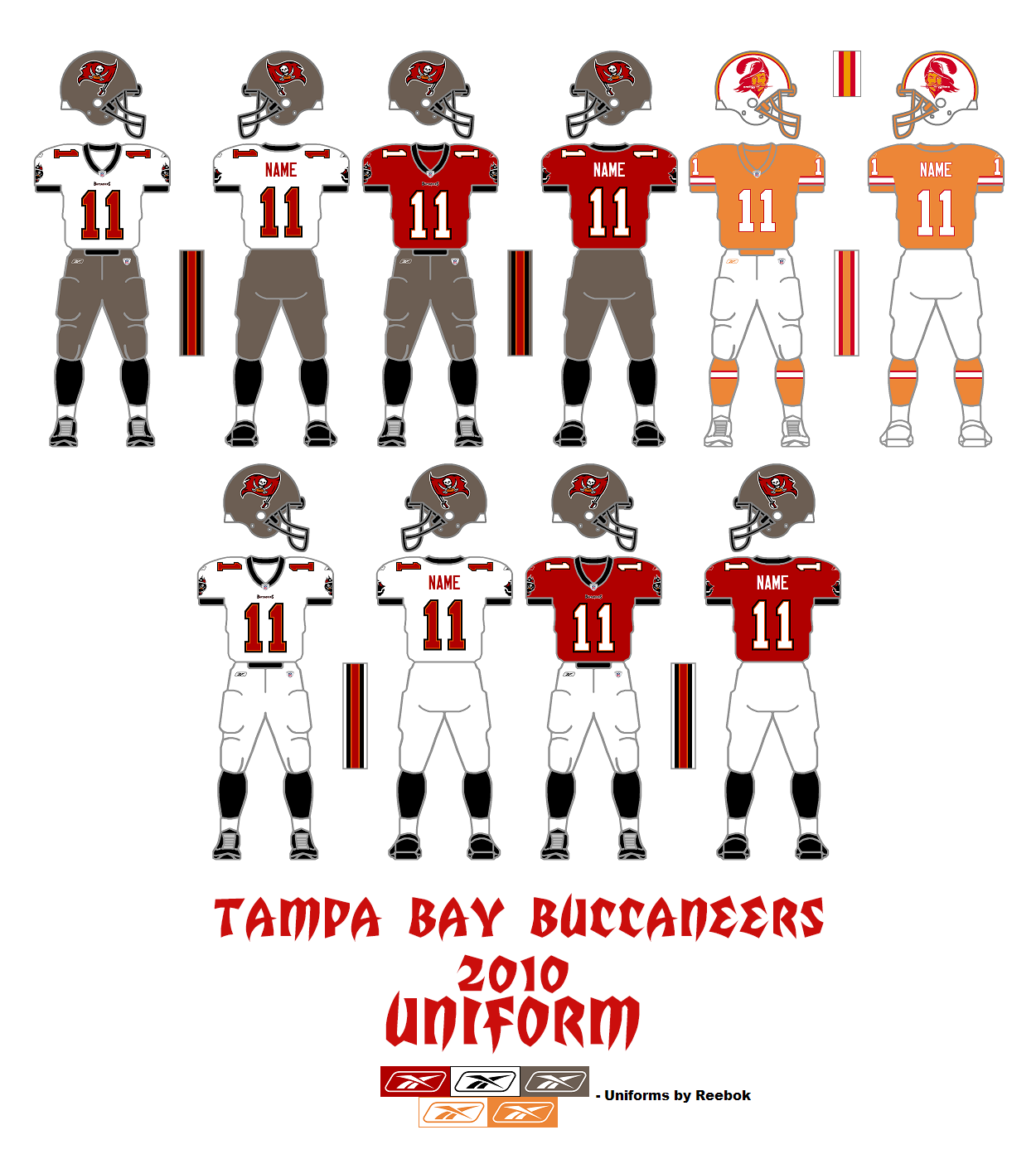 The base uniform color has been energized with richer pewter, juxtaposed with a brighter, more vibrant shade of "Buccaneer Red". In homage to the Buccaneers' early uniforms, the look also features "Bay Orange" as a new primary trim color and accent on both the jersey and the pants. Tampa Bay also becomes the first NFL franchise to incorporate a revolutionary reflective chrome border around the numbers on the front, back and shoulders. The chrome border incorporates a technologically advanced reflective coating that adds a new dimension, increased readability and a unique glow to the numbers.
