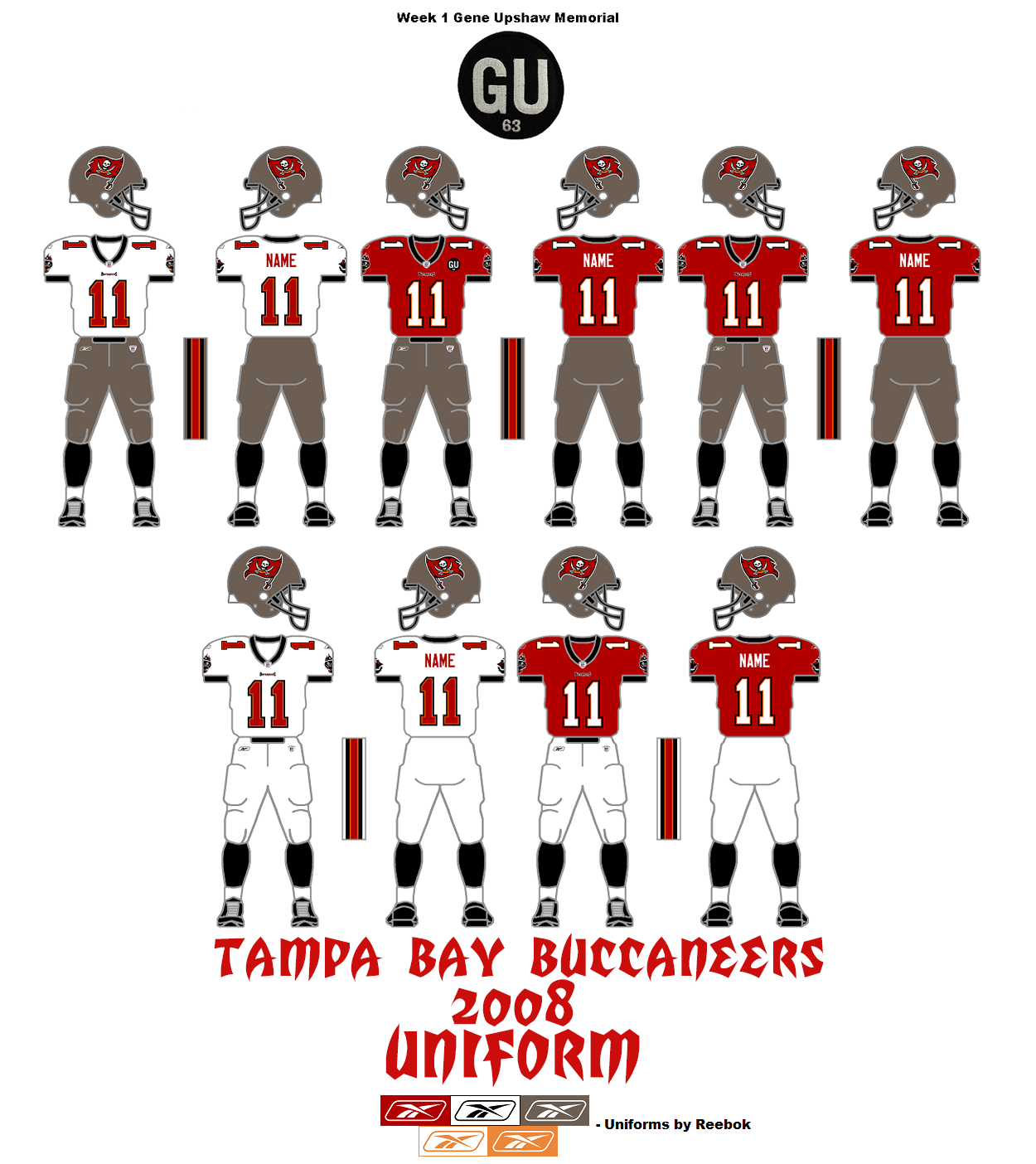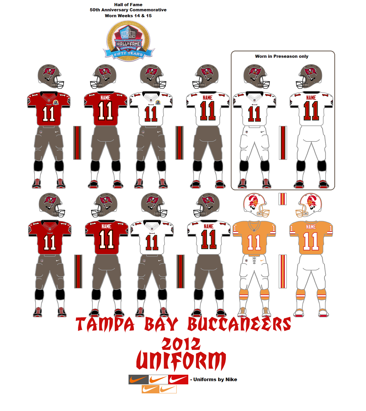 The Bucs revert to using red as their primary jersey color with black accents. The official NFL logo is placed right underneath the V-neck of each player’s jersey. A pewter becomes the main color on the team’s helmet and pants. The uniform also features the "Hall of Fame" Fifty Years celebration patch worn on the jerseys left chest.