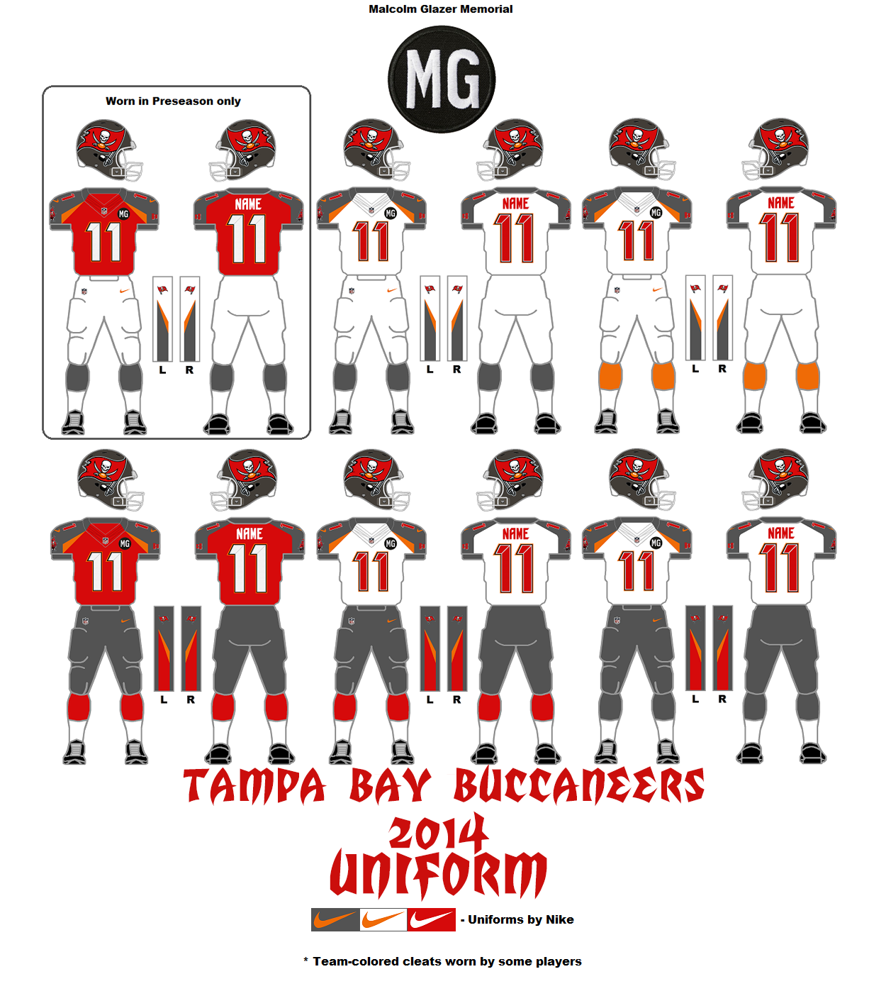 Nike unveiled the team's new NFL Nike Elite 51 Uniform design for the 2014 season. The uniform is a completely integrated system of dress with a new design that honors the Buccaneers' rich tradition while boldly bringing the team into the future through a modern industrial design aesthetic.