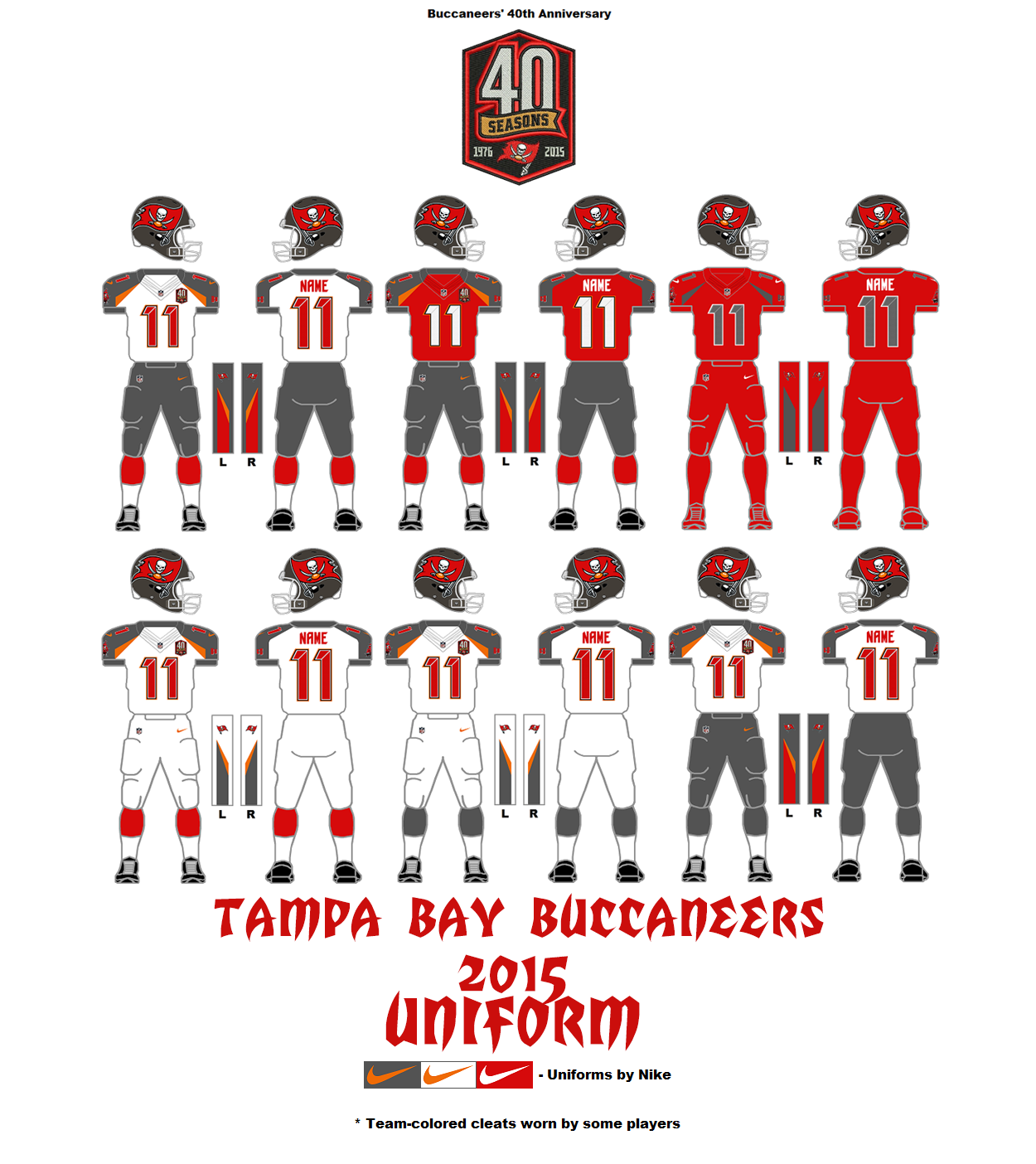 The 2015 road jersey opts for white shirts with red lettering outlined by black and orange trim. The collar is divided into two sections: white and pewter. The Bucs use white as the lone color on the pants, which evolves the simpler look. The Buccaneers will debute the new Color Rush jerseys for the Thursday Night Football matchup with the St. Louis Rams. One final uniform note: If you look closely, you’ll notice an “Buccaneers 40th Season” patch - 1976 - 2015. The Tampa Bay Buccaneers unveiled a commemorative patch that the team will wear on its jerseys during the 2015 campaign in recognition of the organization’s 40th season celebration. The hexagonal patch features a “40 Seasons” banner, along with the current Buccaneers logo flanked by the years of the franchise’s inaugural and current seasons on a pewter backdrop with red outlines. The design also incorporates “Bay Orange” and white, as a tribute to the team’s original color scheme and uniforms that were worn from 1976-1996.