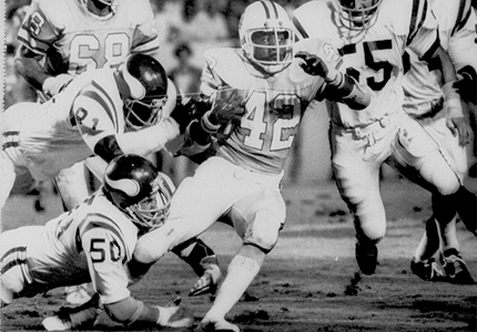 As the first overall pick of the 1977 draft Bell never really lived up to the hype, particularly when you consider, coach John McKay chose him over Tony Dorsett who went to the Cowboys with the second selection. Bell was at his best in the playoff run of 1979 but his numbers went downhill after that and was traded to San Diego after his fifth season with the Buccaneers. He sadly passed away in 1984 as a result of heart problems. The story of his life can be seen in the film "Triumph of the Heart".